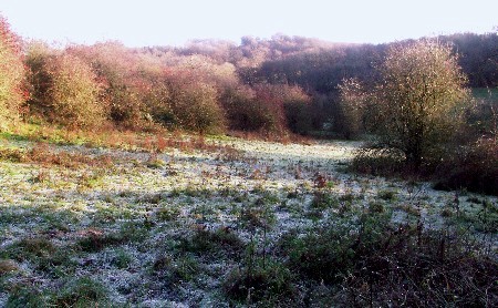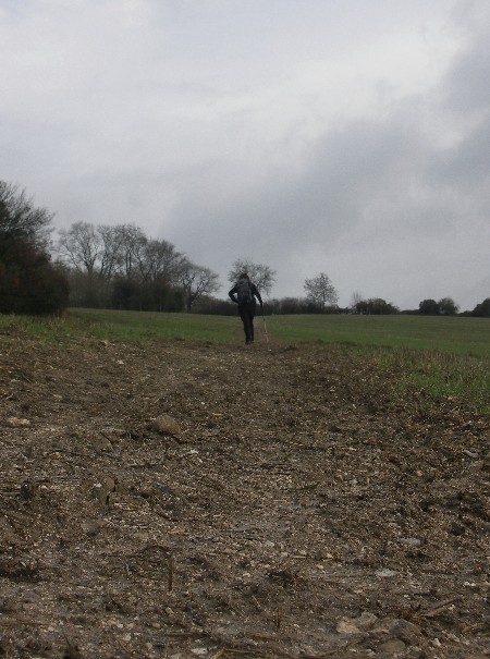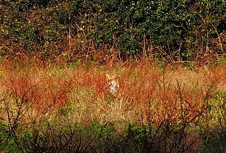 Sadly not cold enough to harden the ground and once the sun had taken the thin layer of ice away we were up to our ankles again in mud. Another indication that the weather is affecting the local habitat, Gorse which normally starts to flower in February was already in bloom. Kev had devised a short 14 mile circular walk using a combination of local footpaths and the North Downs Way, including the small section we still had to check, so we headed east not quite sure of what we would find. Generally paths away from the main North Downs Way can be difficult to follow, blocked or overgrown. A full description of the walk will be posted shortly on our 'Day Walks' section. We parked at Cudham and set off, with map in hand heading out into the unknown on 'Kev' s Kentish Cobble'. It was so good to be navigating a route once again rather than blindly following established waymarked routes. As we followed paths south, through open farmland, towards the North Downs we were amazed by the scenery, a series of little valleys, and eventually following an old track to meet the North Downs at a spot where we had passed many times before and wondered 'where does that track go to?' Well now we know. Then following the North Downs Way we headed towards Knockholt Pound and Otford recalling our walk along the downs last March when the woods were full of snowdrops, even with the mild weather there will still be a few months before we see these again but we did come across plenty of wildlife, the fox below was doing it's best to keep absolutely still and bend into the grasses, a deer shot of into the distance and Kev kept saying 'if only I had a new camera with zoom lenses for Christmas!' (He wishes!!!!! - his "old" camera is less than 12 months old.............., so no chance!!!)