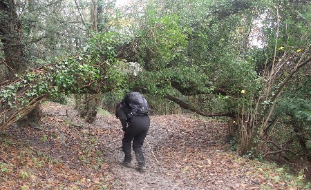 As we had walked along the central part of the 10 mile section we monitor last week, leaving just a few miles at each end of the path to check before the end of the year, we decided to head west to Gatton Park and then walk the 8 miles along the North Downs Way to the 'missing signpost', the location of another significant tree, an old beech that had marked the point where two paths split, before heading back to Gatton, a nice 16 mile walk - still some way short of the Long Distance Walkers 50 km. This section of the trail passes through the old part of Merstham with it's little cottages and medieval church before taking advantage of a pedestrian bridge to cross the M25, the white doves that roost in the dovecote behind the Old Forge were taking advantage of the sun, sitting on the lighting gantries above the busy motorway, an odd sight, the bird of peace above the chaotic motorway! We then continued on under the M20 before approaching the western end of our 10 mile section near Godstone vineyard, the vines that had been full of grapes ripening in the late summer sun just a few months ago are now bare, thankfully you can still get one of the by-products in a bottle from the shop!