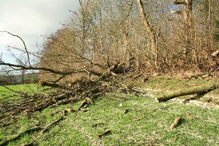 Kev often sits on the bench thinking that it would be ironic if the actual line of the Pilgrim's Way now lay buried under the M25. Anyway, back to the tunnel which although it was started in 1865 no trains were to pass through for at least another 15 years! The original franchise ran into financial problems and went bankrupt, probably not helped by a riot amongst workers. The railway company used a Belgian workforce ( the return of the Cantiaci? ) who became involved in an affray with some local English workers in the Belgian's shanty town' bar. What exactly caused the riot appears uncertain but the bar and quite a few of the shanty houses were destroyed in the fighting. The local authorities at the time came up with quite a novel solution to stop the rioting, bribe them with beer, great idea leave them to get completely hammered and then go in and pick up the pieces. Two of the arrested Belgians later escaped, running naked into nearby woods, it isn't clear why they were in a state of undress. Once the trains started running the wealthy socialites and leading intellectuals of the time realised that they could leave the old dirty crowded City of London, live in the country and still be able to pop back for the odd social engagement in town. Villages like Oxted started to expand. The new elite moved into their fashionable designer houses built in a mock Tudor style with staged interior designs, no doubt holding trendy, fashionable, literary evenings for their A list guests. Ah... the good old days ... seems that very little has changed. Isn't history great! After a week away in sunny Austria watching the snow rapidly melting around us we arrived back in the UK to 99 mile an hour gales. It appears that the weather is going mad all over Europe. The gales have caused quite a bit of damage in most of the woodland areas on this section of the North Downs Way with fallen branches and in the worst cases uprooted trees blocking the path. Thankfully nothing quite like the damage caused by the 'Great Storm of 1987' which caused widespread destruction throughout the South East.